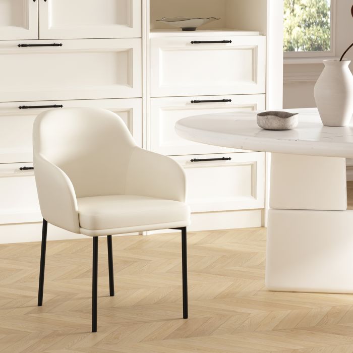 - Features a smoothly contoured, gently curved seat and backrest in leatherette, complemented by slender, tapered metal legs with a refined, brushed finish for a modern accent.